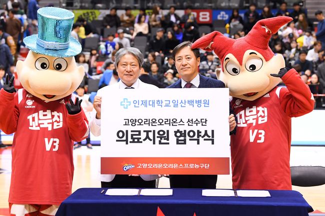 이날 협약식에서 오리온과 일산백병원은 오리온 홈경기 의료지원은 물론 선수들이 최상의 경기력을 선보일 수 있도록 양질의 진료 서비스를 제공하기 위한 업무협약을 맺는다. 오리온은 2014-2015시즌부터 5시즌째 일산백병원과 선수단 진료 협력을 이어오고 있다.