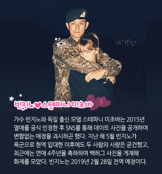 가수 빈지노와 독일 출신 모델 스테파니 미초바는 2015년 열애를 공식 인정한 후 SNS를 통해 데이트 사진을 공개하며 변함없는 애정을 과시하곤 했다. 지난 해 5월 빈지노가 육군으로 현역 입대한 이후에도 두 사람의 사랑은 굳건했고, 최근에는 연애 4주년을 축하하며 백허그 사진을 게재해 화제를 모았다. 빈지노는 2019년 2월 28일 전역 예정이다.