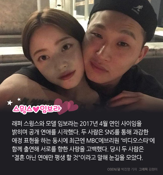 래퍼 스윙스와 모델 임보라는 2017년 4월 연인 사이임을 밝히며 공개 연애를 시작했다. 두 사람은 SNS를 통해 과감한 애정 표현을 하는 동시에 최근엔 MBC에브리원 '비디오스타'에 함께 출연해 서로를 향한 사랑을 고백했다. 당시 두 사람은 "결혼 아닌 연애만 평생 할 것"이라고 말해 눈길을 모았다. /parkjy@osen.co.kr