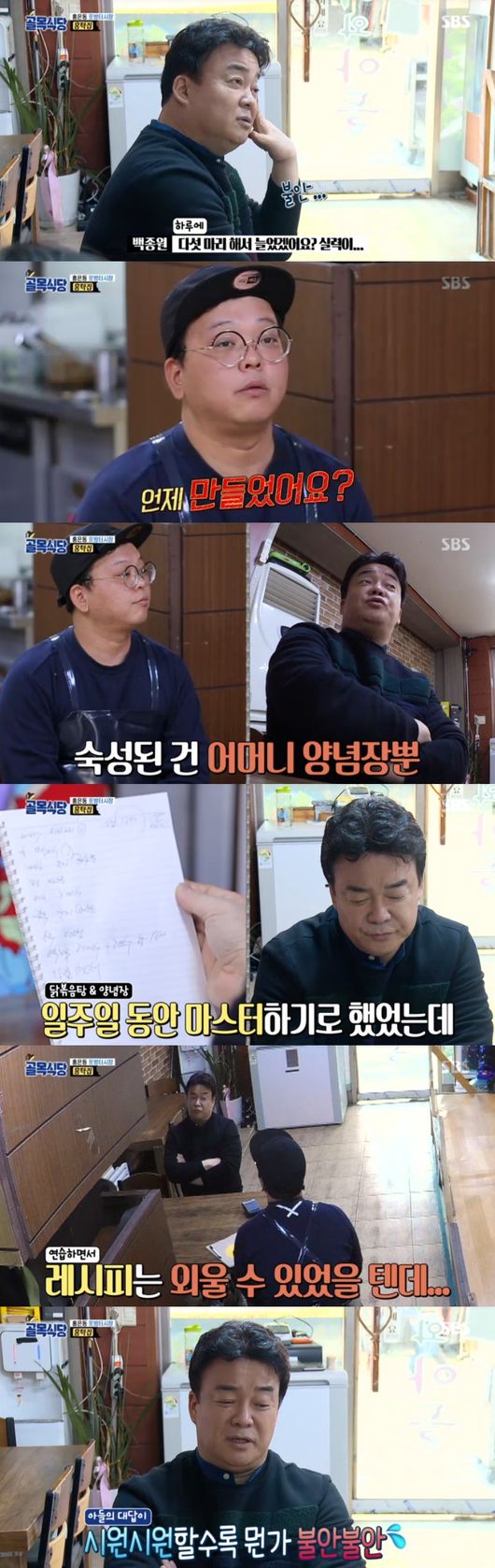 백종원은 어머니 닭볶음탕 마스터 하되, 아들이 직접 양념장을 만들어야 했던 숙제를 언급, 하지만 숙성된 건 어머니 양념장 뿐이라고 했다. 잘 못 알아들었다는 이유였다. 어제 급히 아들이 만들어낸 양념장은 결국 미숙성 상태였다.
