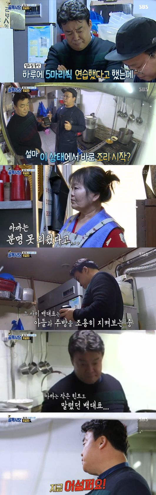 실전검사를 시작했다. 일주일동안 하루 다섯마리씩 닭 손질연습을 했다기에 기대감을 안겼다. 하지만 미숙한 모습 뿐이었다. 대답만 당당한 아들에게 백종원은 한숨만 쉬었다. 이어 형식대로 닭 자르기만 연습한 아들을 지적했다. 모든 닭요리에서 잡내나는 내장 제거는 기본이지만 이를 제거하지 않은 것. 삶는 동안 양념장을 검사했다. 어머니와 아들의 양념장을 비교했다. 이어 혼자 양념장 만들기를 눈 앞에서 보여달라고 했다. 아들이 재료를 찾는 사이, 백종원이 주방상태를 점검했다. 제대로 보는 주방은 처음이기에 점점 표정이 굳어졌다.