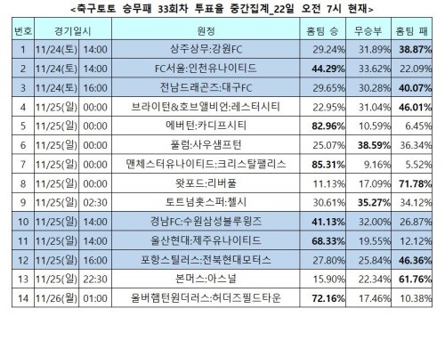 K리그 및 EPL 14경기 대상 축구토토 승무패 33회차 투표율 중간집계 결과