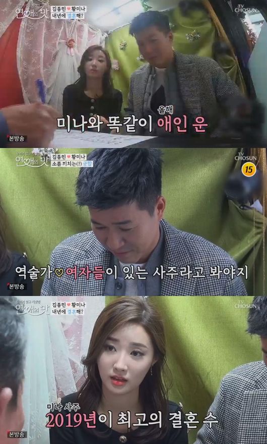 역술가는 "김종민도 올해 애인운이 들어왔다. 똑같이 들어온 상태다. 내년에 결혼해야 한다. 김종민 평생에 가장 좋은 해다. 이정도로 잘 맞는 커플이 별로 없다. (결혼) 해야 한다"며 "황미나는 백두노랑(머리가 하얗고 늙은 신랑)과 결혼해야 한다. 둘의 나이차가 어린 거다. 김종민을 안 만났으면 나이 차이가 더 났을 거다"라고 했다. 또 역술가는 두 사람에게 방송에서 하는 연애가 아니라 진짜 몰래 만나라라고 조언을 건네기도 했다.