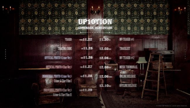 첫 번째로 공개된 컴백 스케줄러에 따르면 업텐션은 오는 12월 6일 신곡을 발표할 예정이며 티저를 시작으로 트레이싱 코드, 클루 앤 크라임 필름, 트랙리스트 등 컴백 콘텐츠들을 순차적으로 공개할 예정이다.