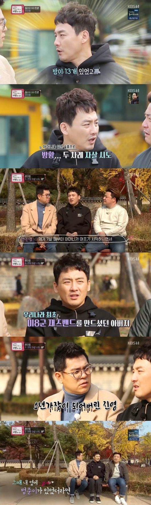 어머니가 돌아가신 후 아버지의 관절염까지 악화되자 현진영은 하루 아침에 소년가장이 됐다. 그는 “아버지가 지병이 있으셨다. 어머니가 돌아가시고 관절염이 심해지셔서 거동을 못하시게 됐다. 그래서 막연히 제가 돈을 벌어야겠다는 생각이 들어서 이것 저것 아르바이트를 많이 했다. 우유 배달 신문 배달도 하고 접시도 닦고 너무 한심스러웠다 제 자신이. 나 하나 없어지면 깔끔하게 정리되는 거 아닌가 싶었다. 그래서 죽으려고 안 좋은 행동도 두 번이나 했다”며 “난간에 매달려서 강을 보는데 강이 나를 부르는 거다. 그냥 뛰어내렸다. 그런데 뭔가 발에 닿더라. 순간 발을 박차고 나오면서 살아야겠다는 생각이 들어서 정신없이 헤엄쳐서 나왔다. 그리운 사람들 생각이 많이 났다”고 전해 MC들의 눈물샘을 자극 했다.
