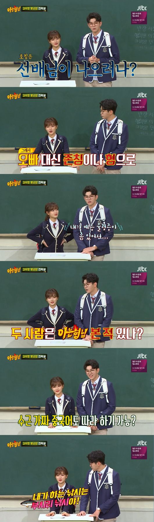 24일 오후 방송된 JTBC 예능 ‘아는 형님’에서는 새 월화드라마 ‘일단 뜨겁게 청소하라’의 주인공 윤균상과 김유정이 출연했다.