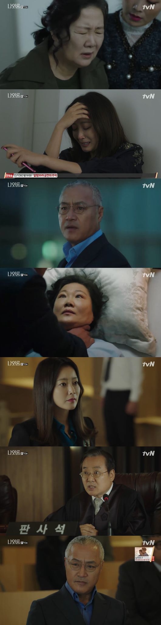 24일 방송된 tvN '나인룸'에서 을지해이(김희선 분)는 그동안 승률에 목숨걸며 돈으로 증인을 매수하는 등 자신이 저지른 잘못을 반성했다. 그래서 뒤늦게나마 장화사(김해숙 분)를 돕기로 했다. 하지만 이들의 복수 계획을 눈치 챈 기산(이경영 분)은 서비서를 을지해이의 집에 보내 살해하도록 지시했다.
