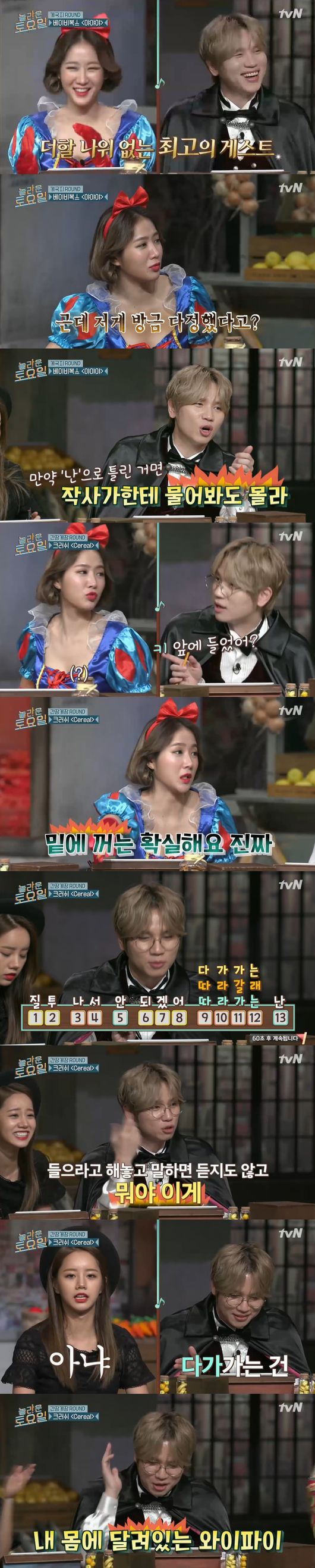 소유와 혜리는 가사 한 부분을 두고 엇갈렸다. 멤버들이 열을 올리며 가사를 맞히는 사이 알레르기 때문에 간장게장을 못 먹는 케이윌은 조용했다. 그는 "들은 걸 말하려고 해도 안 듣지 않냐"며 멤버들의 푸대접에 또다시 섭섭해했다.
