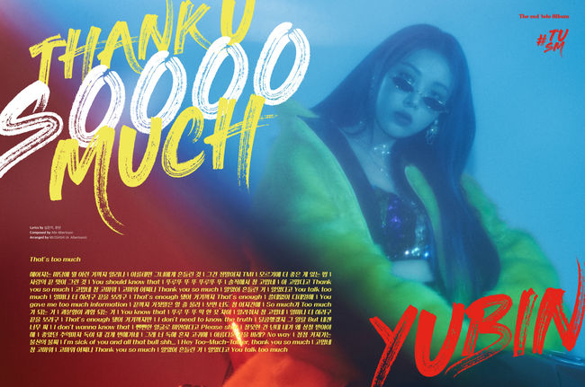 이번 'Thank U Soooo Much' 풀 리릭 티저 이미지는 유빈의 화려한 비주얼을 배경으로 "솔직해서 참 고맙네 아 고맙다고 Thank you so much", "쓸데없이 디테일해 You gave me too much information", "아름다운 끝을 바래? No way 점점 커져가는 불신의 불씨" 등 이별의 과정에서 TMI(Too Much Information)를 남발하는 상대방에게 '참 고맙다'는 반어법적 표현으로 시크하고 와일드하게 작별을 고하는 가사를 담았다.