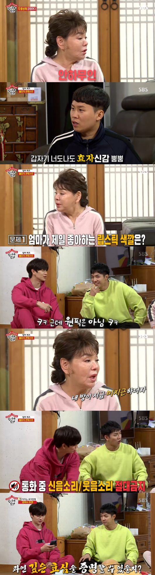 김수미는 "평소에 엄마랑 잘 얘기 안하지 않냐"고 물었다. 그러면서 평소에 엄마에 대해선 얼마나 아는지 물었다. 첫 문제는 엄마가 가장 좋아하는 립스틱이었다. 이후 엄마가 가장 좋아하는 음식에 대해서도 질문, 갑자기 너도나도 효자타임으로 변해 웃음을 안겼다. 김수미는 각각母에게 전화를 걸어 대답을 들어보기로 했다. 1등 불효자에겐 벌칙이 준비되어 있었다. 승기는 "어머니에 대해 그 동안 잘 몰랐다는 반성하는 의미로 벌칙 받는 것"이라면서도 긴장된 모습을 보였다.