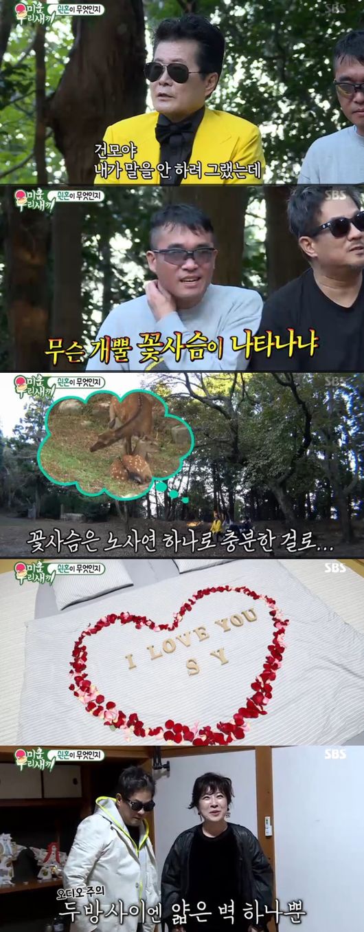 드디어 숙소에 도착한 네 사람, 김건모는 침대에 'I LOVE YOU'라는 문구와 함께 장미꽃으로 신혼방처럼 꾸며놨다. 노사연은 이에 감동하며 기뻐했다. 노사연은 "너무 예쁘다, 여기서 영원히 있고 싶다"고 말하며 감동했다. 이어 대마도 특선요리를 준비했다고 했다. 석쇠에 고운 족발이었다. 그리고 제철을 맞은 벵어돔 회였다. 노사연과 이무송은 서로 먹여주며 애정을 드러냈다. 준비하느라 애쓴 김건모도 함께 시식하며 만찬을 즐겼다. 김건모는 러브샷을 제안, 쑥스러워하는 이무송에게 노사연은 "쉰혼여행인데 제대로 하자"라고 말했고, 모처럼 맞이한 '쉰혼'여행을 즐겼다.