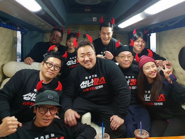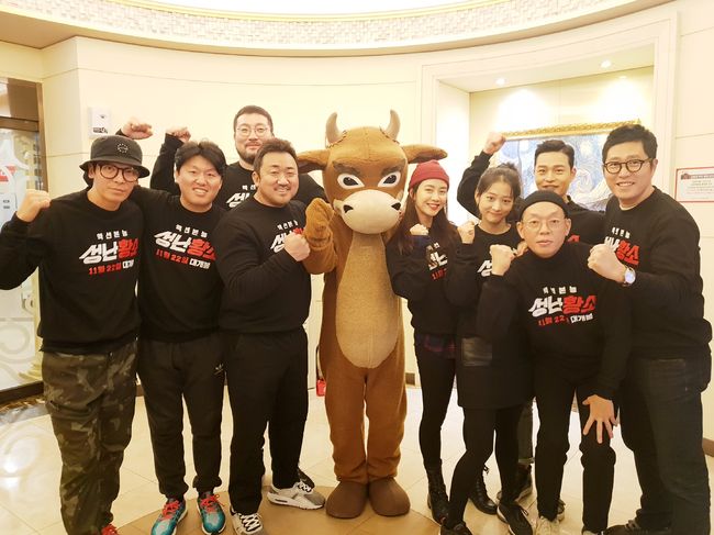 ‘성난황소’의 로고가 적힌 의상을 모두 착용해 함께 열정의 무대인사를 펼쳐 눈길을 끌었다. 올 가을 제대로 액션과 웃음을 선사한 ‘성난황소’는 무대인사에서도 관객들의 웃음을 선사하기 위해 황소 인형과 황소 코스프레, 황소 머리띠, 선물 패키지까지 세심하게 모두 준비해 관객들에게 따뜻한 웃음을 전했다. 더불어 CGV인천에서는 마동석, 송지효, 김성오 배우가 미소지기로 분해 현장에서 관객들에게 티켓을 발권해주는 서비스까지 보여주며 그야말로 No1. 관객 서비스까지 펼쳐 추운 날씨 관객들의 마음까지 따뜻하게 녹여줬다.