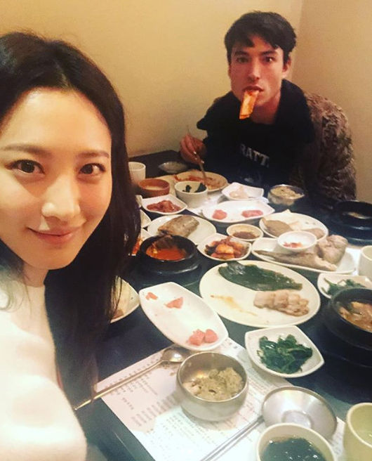 공개된 사진 속 수현과 에즈라 밀러는 함께 한정식을 먹고 있다. 에즈라 밀러는 김치를 먹으며 카메라를 응시하고 있다.