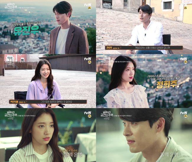 tvN 새 토일드라마 ‘알함브라 궁전의 추억’(극본 송재정, 연출 안길호, 제작 스튜디오드래곤, 초록뱀미디어)은 투자회사 대표인 ‘유진우’(현빈)가 비즈니스로 스페인 그라나다에 방문하고, 여주인공 ‘정희주’(박신혜)가 운영하는 오래된 호스텔에 묵게 되면서 기묘한 사건에 휘말리는 이야기를 그리는 서스펜스 로맨스 드라마. 지난 26일 공개된 ‘알함브라 궁전의 추억 더 비기닝’에는 배우들이 직접 전하는 캐릭터 소개 및 그간 첫 방송을 손꼽아 기다려온 예비시청자들이 궁금해했던 스토리라인이 공개돼 시선을 끈다.