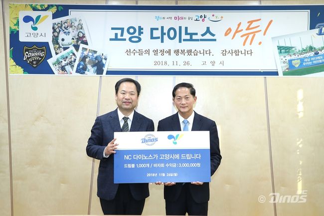 NC 황순현 대표는 26일 경기도 고양시 고양시청에서 이재준 고양시장을 만나 감사패와 함께 '드림볼(Dream Ball)' 1000개, 고양시 장애인체육회에 기부금 300만원을 전달했다. 고양시도 '우리동네 야구단'이란 컨셉트로 고양시민에게서 사랑받은 고양 다이노스과의 이별을 아쉬워하며 꽃다발을 전했다.