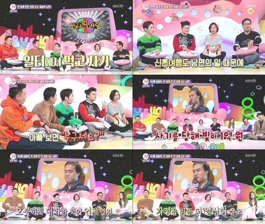 어제(26일) 방송된 KBS 2TV 예능프로그램 ‘대국민 토크쇼 안녕하세요’에서는 하루 24시간 전부를 공장에서 지내고 한 달에 한번 집에 온다는 지독한 일 중독 남편 때문에 고민이라는 ‘남편의 두 집 살림’이라는 사연이 소개되었다.