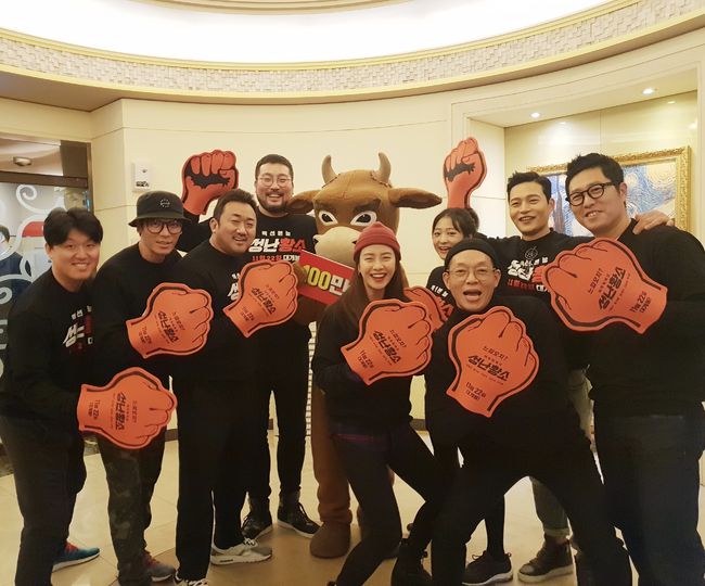 이처럼 흥행 시동을 제대로 건 ‘성난황소’는 100만 관객 돌파 감사 인증샷을 공개했다. ‘성난황소’의 흥행 주역 마동석, 송지효, 김성오, 김민재, 박지환, 이성우, 배누리, 박광재, 김민호 감독까지 영화 속 주요 배우들이 모두 총출동해 환상의 팀워크로 100만 감사를 전한 것. 특히 황소가 인증샷에 등장해 흥행 기운까지 불어넣어 웃음과 재미까지 선사해 눈길을 끈다.