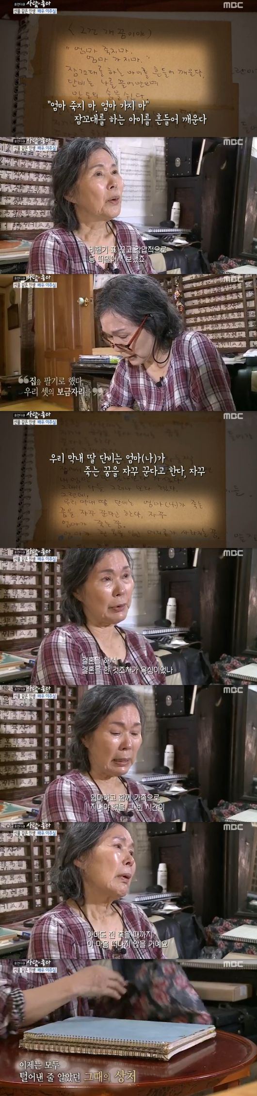 그때 일기엔"건강을 잃으면 모두 잃는 것"이라며 최선을 다해 좀 더 아이들을 곁에 남고 싶다는, 딸들을 향한 시한부 엄마의 고뇌가 고스란히 적혀있었다. 일기와 함께 꺼내놓은 건 애써 감춰뒀던 엄마의 미안함과 죄책감이었다.이주실은 "그 시간을 어머니로서 어떻게 보상하겠나, 아이들에게 미안하다고 눈물을 흘려본 적없다"면서 "그렇지만 죽을 때까지 이 마음 떠나지 않을 것"이라며 참았던 눈물을 흘렸다.