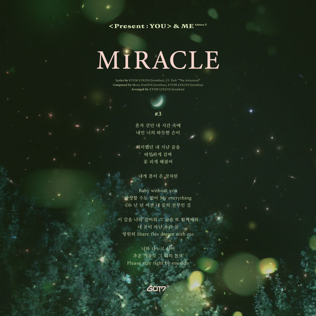 JYP엔터테인먼트(이하 JYP)는 28일 0시 JYP 및 GOT7의 공식 SNS 채널에 새 앨범 ''Present : YOU' &ME Edition'의 타이틀곡 '미라클' 가사가 담긴 이미지를 선보였다.