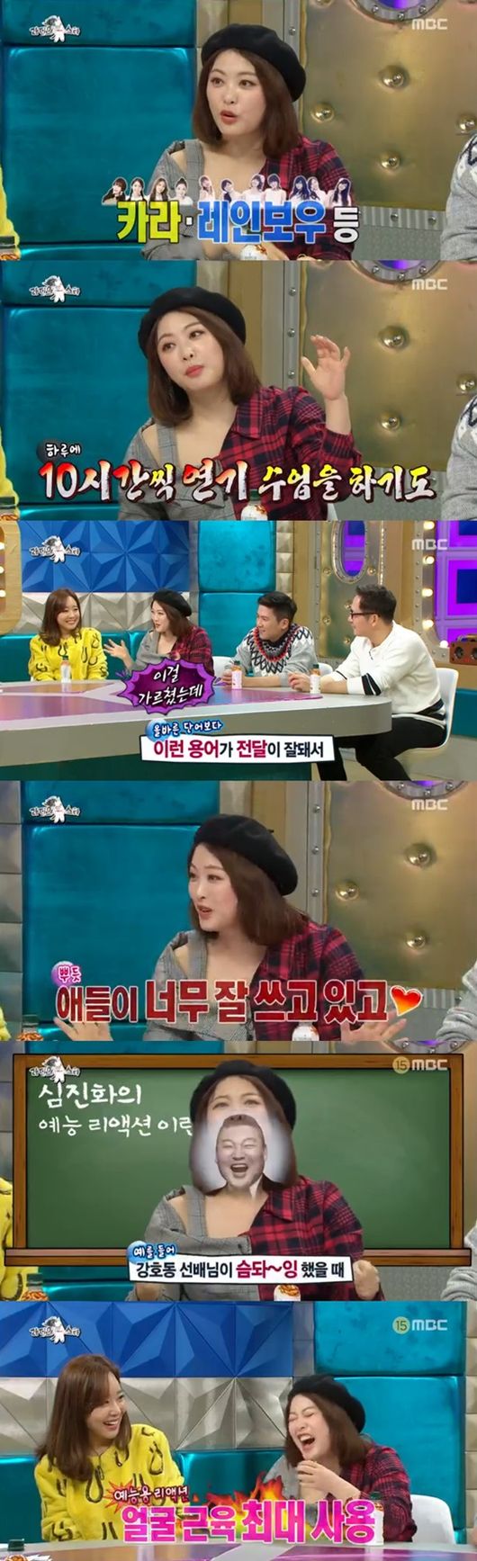심진화는 "DSP에서 연기 선생님을 했다"고 경력을 깜짝 고백하기도. 그는 개그우먼인데 소속사에서 흔쾌히 받아줬다. 그래서 한 3년 동안 연기 선생님을 했다. 카라, 레인보우부터 모두 내가 가르쳤다. 하루에 10시간씩 수업을 하고 그랬다"며 "내가 개그맨 된지 10년이 된 상태였다. 방송용어는 아닌데, '니마이' '오도시' 이런 용어를 썼다. 애들이 이 용어를 잘 쓰고 있다. 예능에 나갔을 때 리액션 어떻게 하는지를 가르쳐준다. '스타킹'할 때 강호동 선배님이 '슴돠'라고 하면 바로 웃으라고 했다. 얼굴 근육 최대한 쓰라고 조언한다"고 밝혀 박수를 받았다.