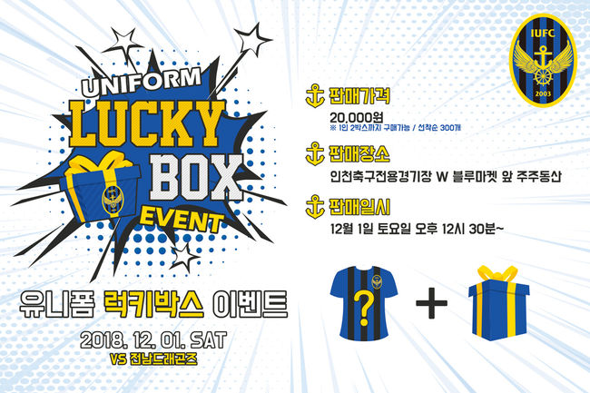 이번 유니폼 럭키박스 판매는 전남전 홈경기 당일 오후 12시 30분부터 인천축구전용경기장 W블루마켓 앞 주주동산에 설치된 부스에서 진행되며, 준비된 선착순 300개가 모두 소진되는대로 마감될 예정이다./dolyng@osen.co.kr