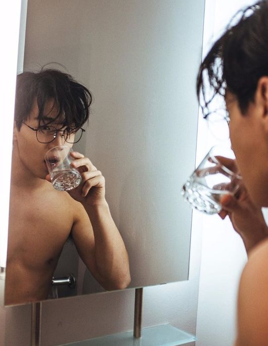 깜짝 놀랄 만한 복근을 공개한 헨리는 "하루에 적어도 물 7잔은 마셔야 한대요"라는 귀여운 문구로 웃음을 자아냈다.