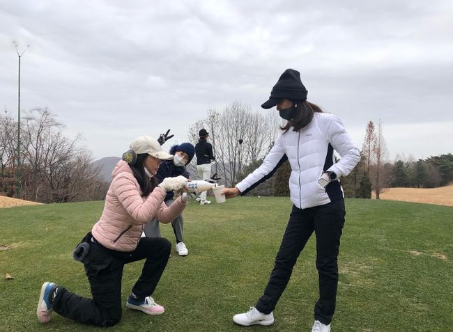 이혜영은 "간만에 골프 벌칙. 패배자는 무릎 꿇고. 승리한 자만이 막걸리를 마실 수 있다"고 무릎을 꿇고 있는 이유를 설명하며 "언제나 만나면 즐거운"이라고 네 여배우의 친분을 과시했다.