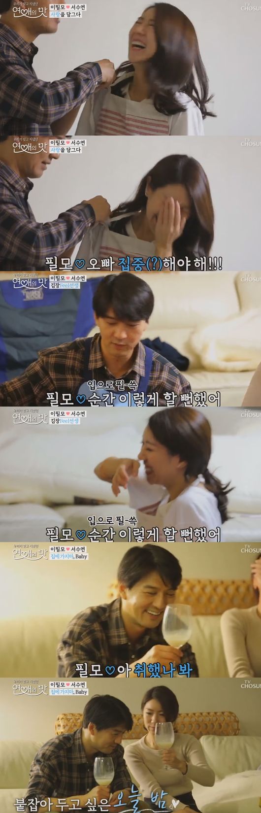 이날 이필모와 서수연은 함께 김장을 담그면서 꽁냥꽁냥 데이트를 이어갔다. 필모가 작업복을 준비하지 못한 수연에게 자신의 옷을 빌려줬다. 이어 다정하게 수연에게 앞치마를 입혀줘 달달함을 자아냈다. 두 사람은 재료를 준비하면서 자연스럽게 허그를 했다.