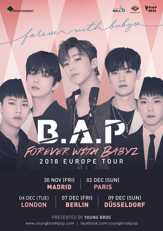 소속사 TS엔터테인먼트에 따르면, B.A.P(힘찬, 대현, 영재, 종업, 젤로)는 30일 오후 8시(현지 시각) 마드리드 공연을 시작으로 총 5개 지역에서 유럽 투어 ‘B.A.P 2018 EUROPE TOUR - FOREVER WITH BABYZ -’를 개최한다.