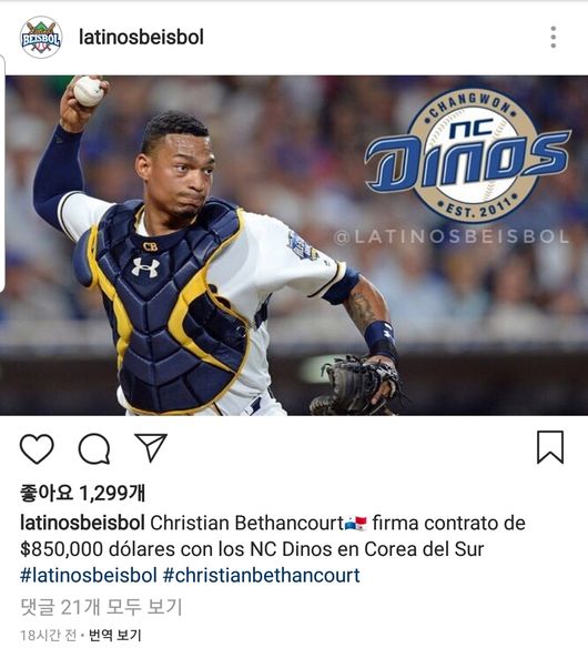 한편 라틴계 야구 소식을 전하는 '라티노 베이스볼' 인스타그램 계정은 지난달 30일(한국시간) "크리스티안 베탄코트가 NC 다이노스와 85만 달러에 계약을 체결했다"고 전했다.
