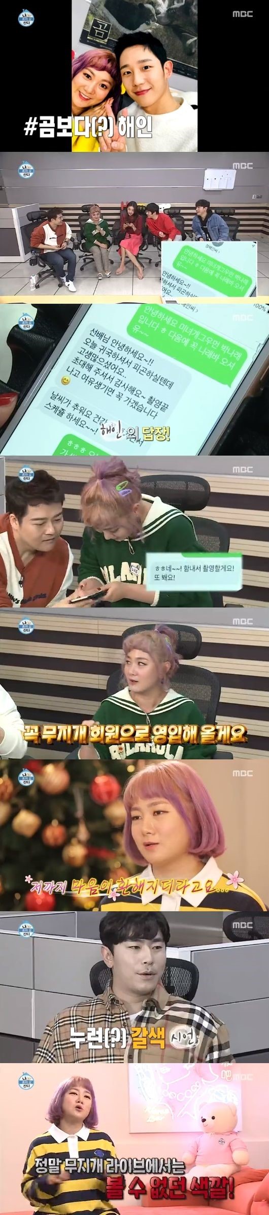 박나래, 정해인은 MBC 창사특집 다큐멘터리 '곰'의 예고편 녹음을 위해 만났고, 방송국 더빙실에서 재회했다. 박나래는 정해인을 만나자마자 팬심과 사심을 동시에 쏟아냈고, "목소리가 너무 좋다. 잘생겼다"며 칭찬을 아끼지 않았다.