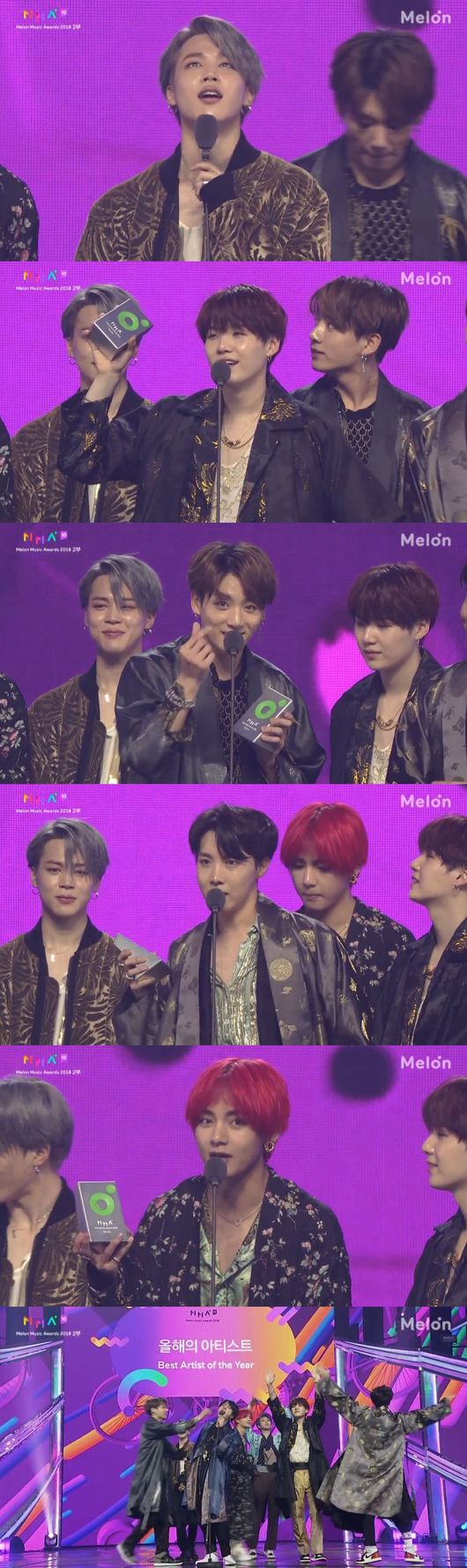 방탄소년단은 지난 1일 오후 7시부터 서울 구로구 고척동 고척스카이돔에서 진행된 '2018 멜론뮤직어워드'에서 무려 7번 수상자로 호명됐다. 네티즌 인기상, 카카오 핫스타상, 뮤직스타일상 랩/힙합 부문, 글로벌 아티스트상, 톱10에 올해의 앨범상, 올해의 아티스트상 총 7개의 트로피를 들어올렸다.