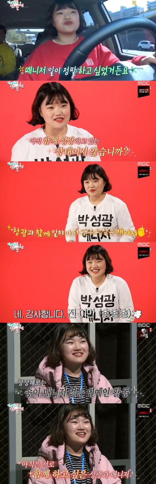 전화를 끊고 박성광은 송이 매니저가 누구 팬인지 물었다. 송이매니저는 동방신기 팬이라고 했다. 왜 말하지 않았는지 묻자, 송이 매니저는 "전담하는 연예인을 좋아해야하는데 다른 연예인 좋아한다고 하면 서운하실까봐"라며 속 깊은 모습을 보였다. 이어 둘 중 고르라고 하자, "박성광"이라면서 "오빠와 저는 함께 성장해가는 것"이라며 의리를 보였다.