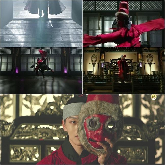 어두운 편전 안, 열린 문 사이로 밝은 빛이 쏟아지며 붉은 도포를 두른 광대가 등장해 시선을 강탈한다. 편전에 들어선 광대는 화려하면서도 격정적인 춤사위를 펼치고 있는데 꽹과리 소리에 맞춰서 허공으로 거침없이 내뻗는 손동작이 한시도 눈을 떼지 못하게 한다.