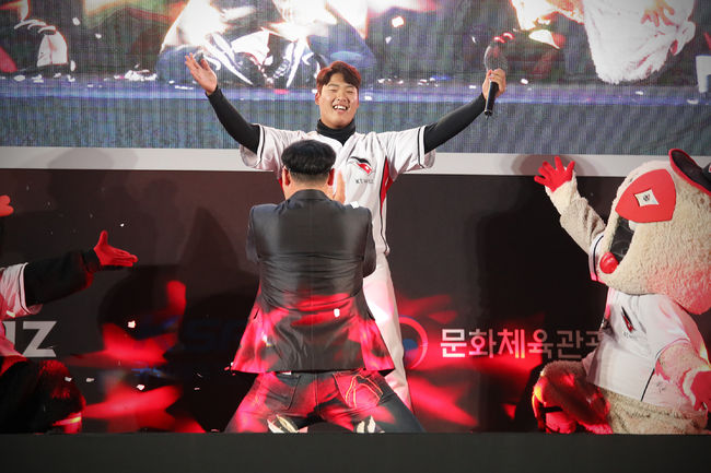 올해 알찬 프로 1년 차를 보낸 강백호도 팬들 앞에서 화끈한 무대를 선사했다. 강백호는 팬들의 요청에 김주일 응원단장과 함께 가수 승리의 ‘셋 셀테니’를 열창하며 팬들의 박수를 이끌어냈다.