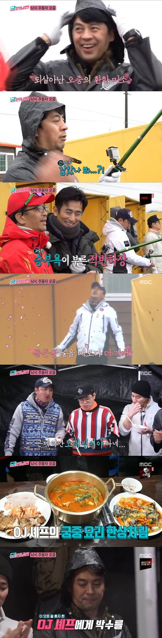 낚시를 끝낸 이후 권오중은 멤버들을 위해 궁중 만찬을 준비했다. 권오중은 재료 손질까지 다 해서 챙겨왔다. 권오중의 큰 뜻과 달리 멤버들은 천천히 진행되는 요리에 당황했다. 권오중은 멤버들의 의견과 상관없이 의지대로 요리를 진행했고, 멤버들은 권오중의 요리에 큰 리액션으로 답해줬다. 하지만 기대에 못 미치는 맛에 당황해 웃음을 줬다. 권오중은 3시간 만에 궁중 만찬을 완성했다. 멤버들은 권오중의 궁중만찬에 혹독한 평가를 내렸다. /seon@osen.co.kr