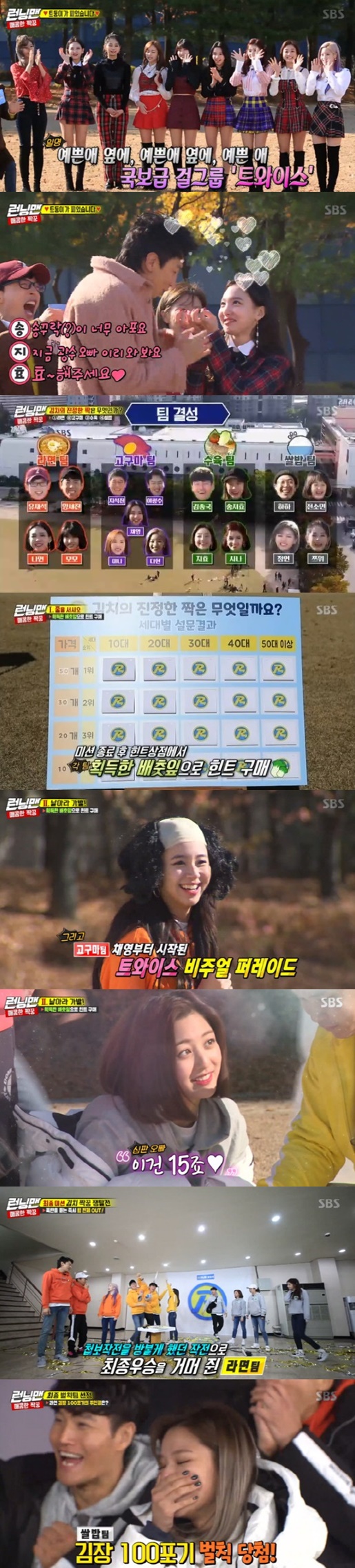 이날 방송은 김치의 진정한 짝을 찾는 김장특집 ‘매콤한 짝꿍’ 레이스로 꾸며져 ‘런닝맨’ 자매그룹 트와이스가 전격 등장해 멤버들의 환호를 자아냈다. 이번 레이스는 팀 대결로 꾸려지는 만큼 라면 팀에는 유재석, 양세찬, 모모, 나연, 고구마 팀에는 지석진, 이광수, 채영, 미나, 다현, 수육 팀에는 김종국, 송지효, 사나, 지효, 쌀밥 팀에는 하하, 소민, 정연, 쯔위로 나뉘어졌다.