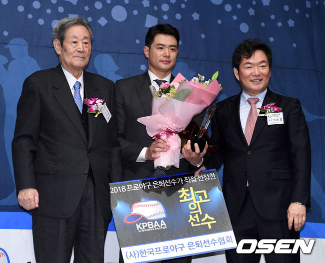 김재환은 6일 서울 양재동 L타워 7층 그랜드홀에서 ‘제 6회 한국프로야구 은퇴 선수의 날’ 행사에서 대상을 수상했다.