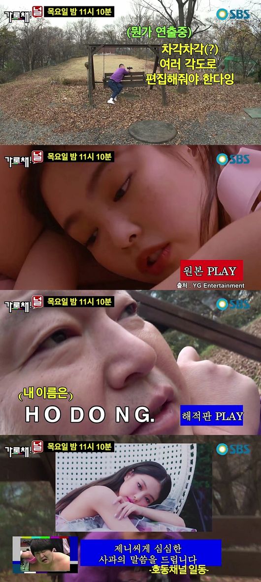 강호동은 렌즈를 자신의 얼굴을 바짝 갖다 댄 뒤 ‘호동’, ‘HODONG’을 ASMR처럼 연이어 속삭였다. 침대에 누워 자신의 이름 한 글자 한 글자를 속삭이던 제니의 뮤비 속 장면을 패러디 한 것. 뒤이어 강호동은 몽환적인 눈빛으로 ‘SOLO’ 노래를 흥얼거리며 ‘빛이 나는 솔로’ 부분을 ‘지지 않는 호동’으로 개사해서 불렀다. 제작진은 ‘해적판’ 강호동의 영상과 실제 뮤비를 교차 편집하며, ‘제니 씨께 심심한 사과의 말씀을 전한다’는 자막을 넣어 또 한번 폭소를 자아냈다.