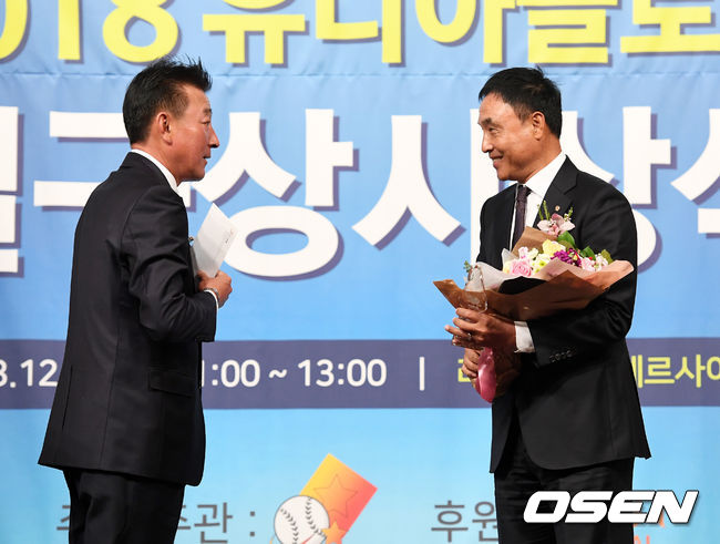 송진우 코치는 7일 서울 청담동 리베라호텔 베르샤유홀에서 ‘2018 유디아글로벌 일구상시상식’에서 ‘프로지도자상’을 수상했다.