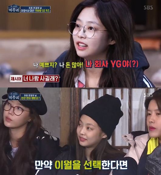 결과 발표 전 아침 식사를 하기 위한 게임이 진행됐다. 매 게임마다 남다른 존재감을 뽐내왔던 제니는 '너 나랑 사귈래?'라는 제시어에 "나 예쁘지?", "나 돈 많아", "나 회사 YG야"라고 말해 웃음을 안겼다.