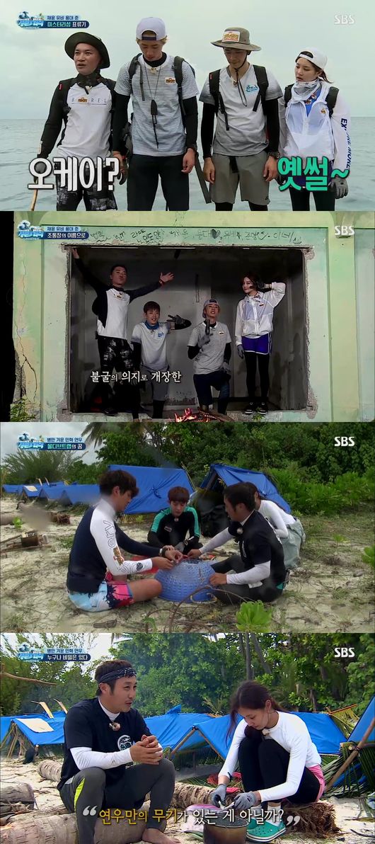 이어 네 사람은 생존에 필요한 물품을 찾기 시작했지만, 갑작스런 폭우로 인해 폐가로 대피해야만 했다. 게다가 거센 비바람에 생존지로 돌아갈 배도 띄우지 못하는 상황. 절망적인 상황에 맏형 조재윤은 “여기서 자는 걸로 하자”며 비박을 제안했다. ‘조통장’ 조재윤의 리드 하에 멤버들은 아지트에 불을 피우고 바닥 걸레질까지 하는 등 완벽한 팀워크로 기적 같은 보금자리를 마련했다.