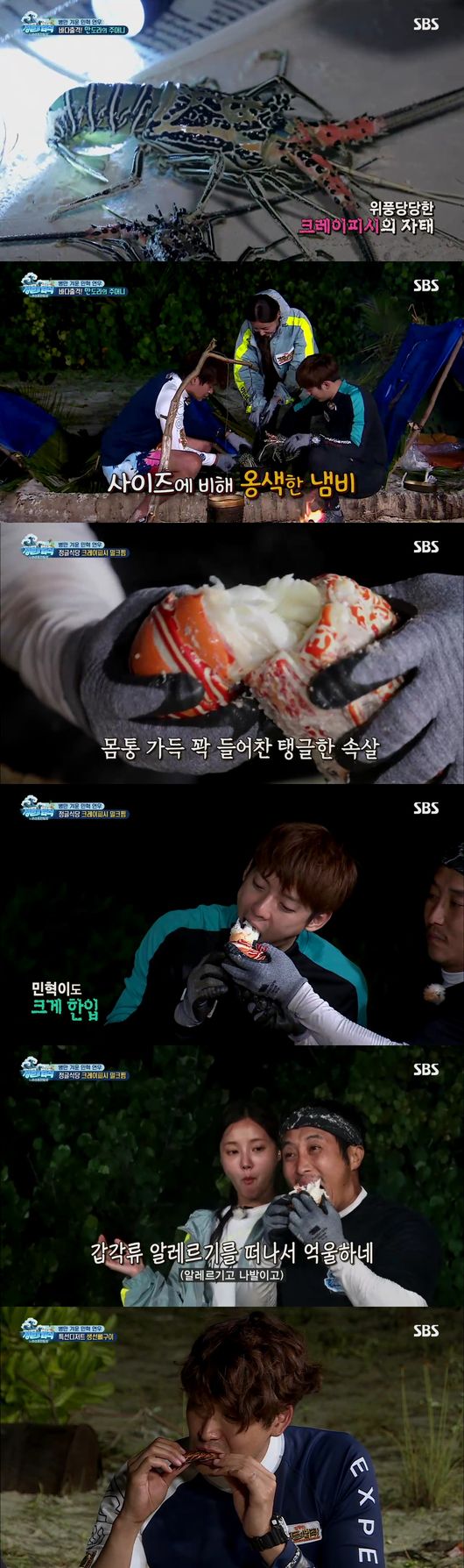 저녁이 되자 김병만은 홀로 바다 사냥에 나섰다. “1인 1크랩 할 거다”라며 망설임 없이 바다로 들어간 김병만은 금세 크레이피시 두 마리와 물고기를 잡아와 멤버들의 감탄을 자아냈다. 멤버들은 만들어 둔 코코넛 오일에 크레이피시를 넣고 끓여 ‘크레이피시 밀크찜’을 만들어냈다. 이를 맛본 멤버들은 엄청난 맛에 말을 잇지 못했다. 민혁은 “씹을수록 깊은 육즙이 나온다”라며 극찬했다. 멤버들이 맛있게 먹는 모습에 갑각류 알러지가 있는 김병만 역시 “이건 약을 먹더라도 먹어야 해”라며 크레이피시를 먹었고 그 맛에 감탄했다. 이어 멤버들은 생선 뼈 구이까지 먹으며 풍요로운 저녁 식사를 즐겼다. 멤버들의 정글 특식 먹방은 14%까지 치솟으며 이날 ‘최고의 1분’을 차지했다. /parkjy@osen.co.kr