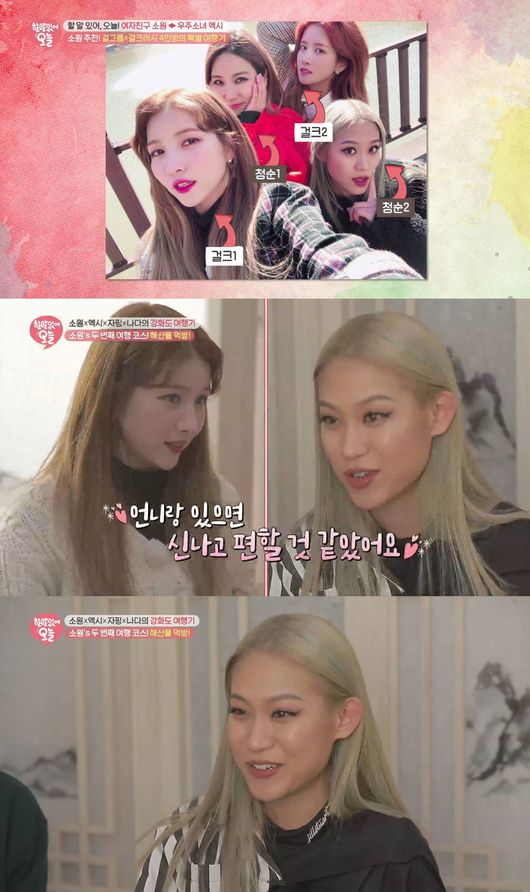 12월 8일(토) 방송되는 MBC에브리원 ‘할 말 있어, 오늘’에서 여자친구의 멤버 소원이 우주소녀의 멤버 엑시를 할 말 대상자로 지목. 둘의 친목을 도모하기 위해 ‘언프리티 랩스타2’의 히어로 자이언트 핑크&나다까지 합세해 새로운 조합으로 강화도 여행을 떠난 모습이 공개된다.
