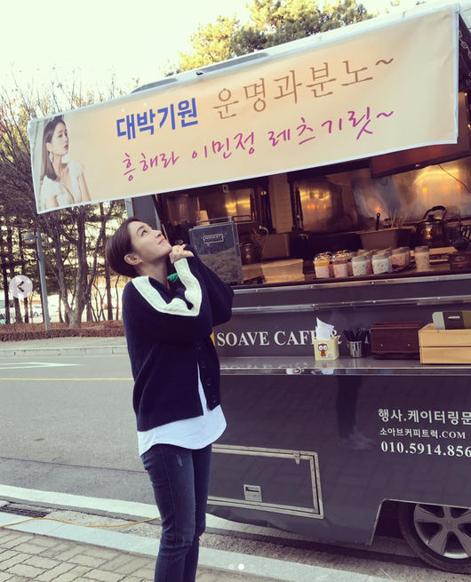 사진 속에서 이민정은 ‘대박기원 ‘운명과 분노’ 흥해라 이민정 레츠기릿’이라는 플래카드가 달린 커피차 앞에서 행복한 미소를 지으며 브이(V)자를 그리고 있다.