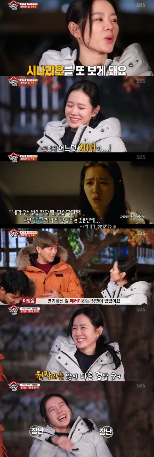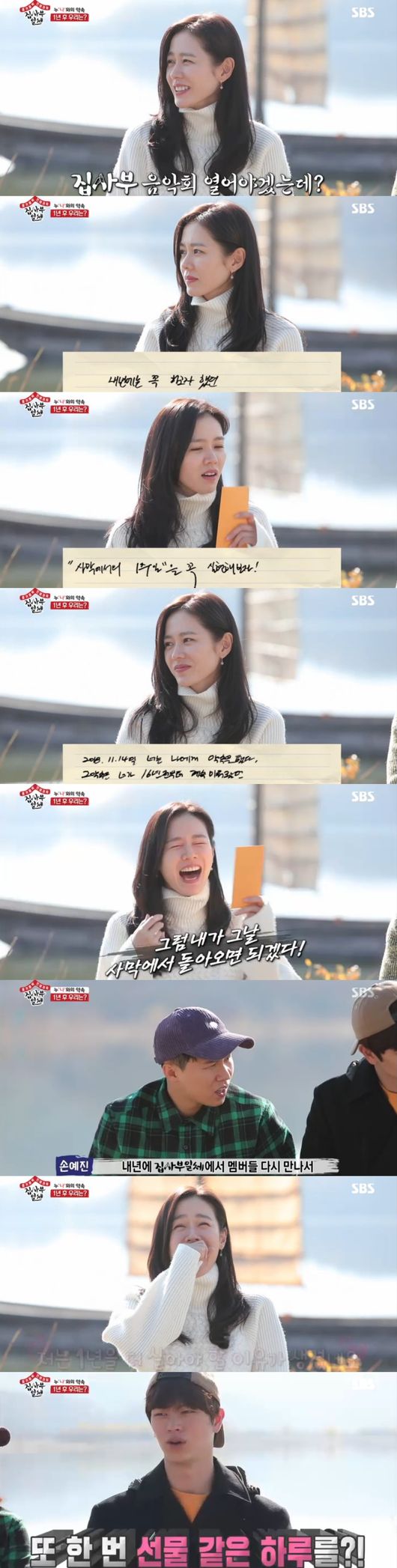 이날 멤버들은 손예진과 바베큐 파티시간을 가졌다. 그러면서 자연스럽게 손예진과 대화를 나눴다. 특히 손예진은 작품 수를 1년에 한 작품씩 꾸준히했다고 했다. 손예진은 "시나리오를 계속보게된다, 놓치면 안 될 것 같은 느낌이 들더라"며 연기에 대한 열정과 욕심이 많은편이라고 했다. 그렇게 20년이 흘렀다고. 손예진은 '아내가 결혼했다'로 유부녀부터, 영화 '외출'로 불륜녀, '연애시대' 드라마로 이혼녀 역을 연기했다고 했다.