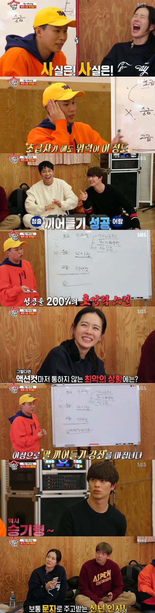 승기는 갑자기 모니터를 준비했다. 손예진은 "준비를 참 많이했다"고 감탄, 양세형은 "제가 또 일을 벌리구나"고 말해 웃음을 안겼다. 보통 문자로 주고받는 신년인사를 예시로 해서 어린 연령대 후배들과 대화를 나누는 법을 전했다. 하지만 모두 이에 공감하지 않았다. 이때, 성재는 "공감한다"면서 현실 '요즘애들'의 대화법을 전했고, 이모티콘의 장점을 전했다. 양세형은 "강의는 별로지만 자연스럽게 예진누나와 단체톡을 만들었다"며 10점만점을 전했다.