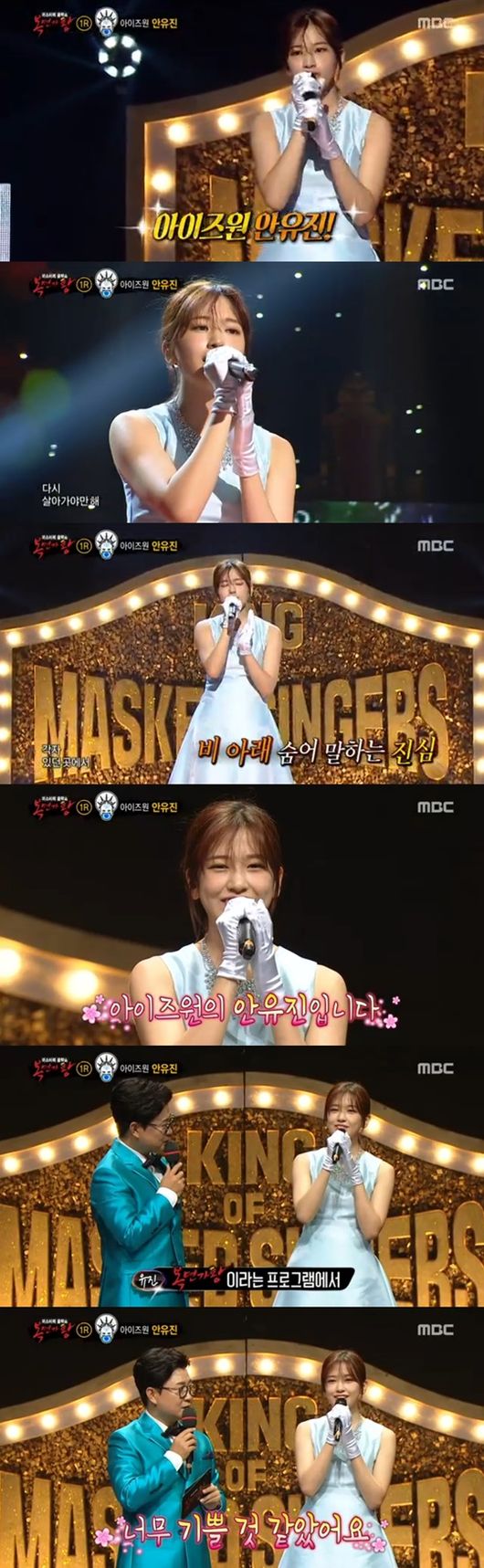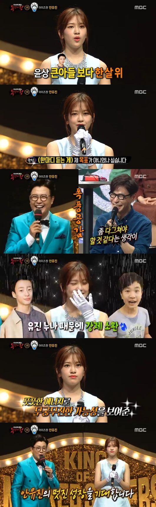 안유진은 많은 관객 앞에서도 떠는 기색 없이 "'복면가왕'을 통해 제 목소리를 들려드릴 수 있는 기회가 있어서 너무 기뻤다. 많이 긴장했지만 잘 마무리한 것 같다"고 활짝 웃었다. 중학생 소녀의 무대 매너에 연예인 판정단은 "너무 귀엽다"며 홀딱 반한 표정들을 지었다.