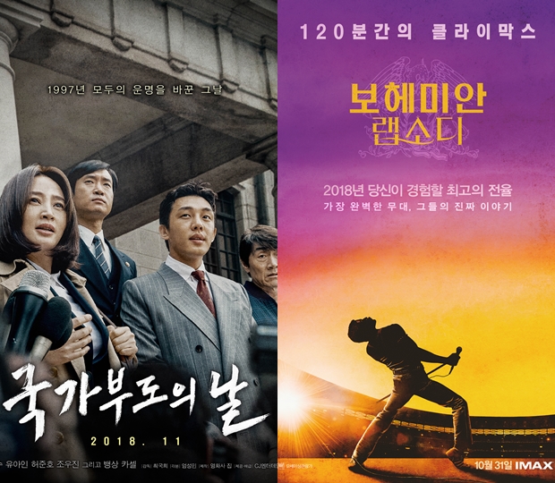 영화 ‘국가부도의 날’(감독 최국희, 제공배급 CJ, 제작 영화사 집)과 ‘보헤미안 랩소디’(감독 브라이언 싱어, 수입배급 이십세기폭스코리아)가 나란히 1,2위를 차지하며 장기집권하고 있다.