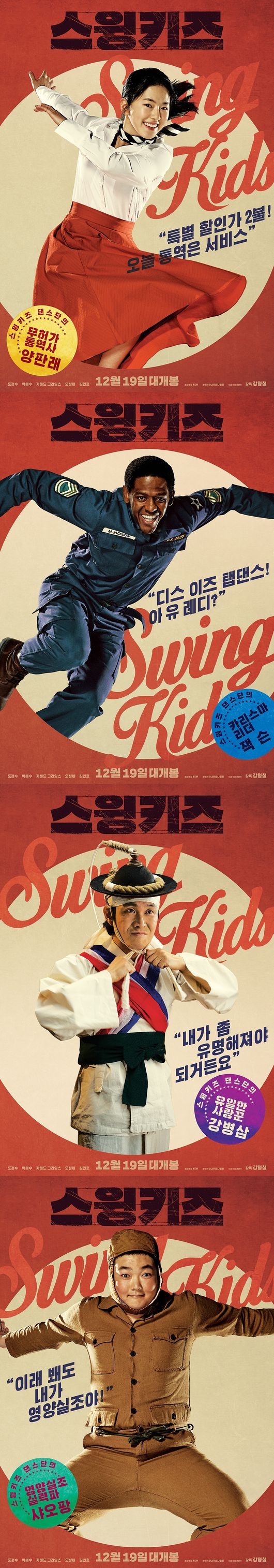 '스윙키즈'는 1951년 거제도 포로수용소, 오직 춤에 대한 열정으로 똘똘 뭉친 오합지졸 댄스단 ‘스윙키즈’의 가슴 뛰는 탄생기를 그린 영화다. 강형철 감독의 감각적인 연출, 끼와 에너지 넘치는 젊은 배우들의 신선한 시너지, 블록버스터급 수록곡과 폭발적인 퍼포먼스로 만장일치 뜨거운 호평을 불러 일으키고 있는 '스윙키즈'가 매력만점 댄스단의 캐릭터 포스터를 공개해 이목을 집중시키고 있다.